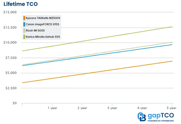 U analizi je jasno istaknuto da je Kyocera TASKalfa MZ5001i model s najnižim ukupnim troškom vlasništva (TCO), ispred uređaja Canon imageFORCE 6155 i Ricoh IM 5000.